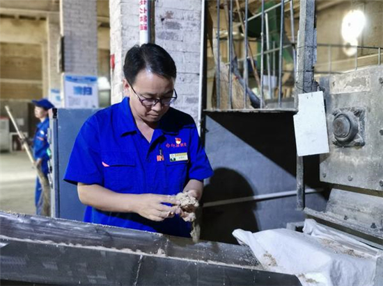 9月17日上午,大河網(wǎng)記者在河南仰韶酒業(yè)有限公司的制曲車(chē)間看到,曲磚生產(chǎn)線(xiàn)正在緊張生產(chǎn),張振科抓起傳送帶上的原料進(jìn)行擠壓,查看原料的水分度和粉碎度。和生產(chǎn)線(xiàn)的工人交流后,張振科又和徒弟來(lái)到曲庫(kù),分別拿起半塊曲磚,放到鼻子下,深深吸氣,嗅聞曲磚的曲香。