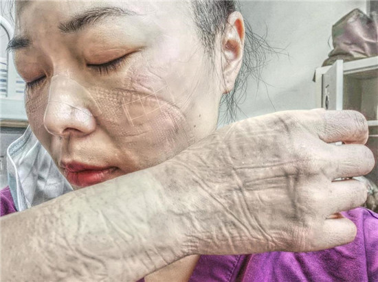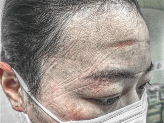 因為新冠肺炎的強傳染性,胡奔奔每次去病區(qū)上班都要全副武裝,而且為保證在6個小時的工作時間內(nèi)不被暴露,不能去衛(wèi)生間,不能喝水,還要穿上成人紙尿褲以防萬一。這樣下來,汗?jié)褚路浅J?,而且下班后脫掉防護裝備后,她原本清秀白皙的臉上,滿是深深的皺褶,久久難以恢復,惹人心疼。給家人報平安時,胡奔奔甚至不敢視頻聊天,只能語音安慰家人。