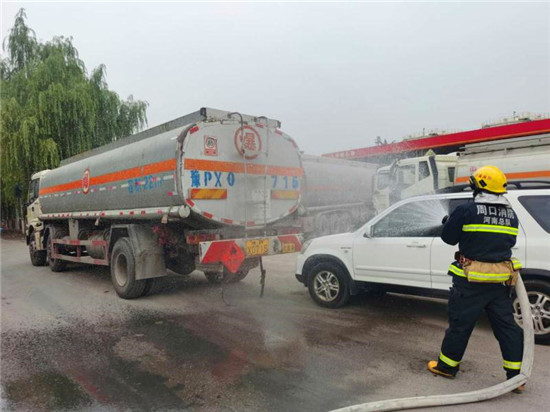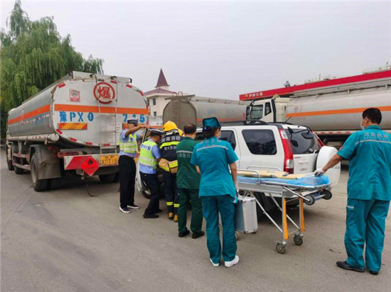 當(dāng)日上午10時,商水交警大隊指揮中心接到報警:在商水縣興商大道與陳勝大道交叉口西、湯莊油庫處,一輛轎車與一輛?;饭捃囎肺蚕嘧玻9摅w損壞,?;沸孤镀鸹穑I車駕駛室變形,駕駛?cè)吮焕к噧?nèi),如不及時救援,駕駛?cè)擞猩kU,另外因事故現(xiàn)場臨近湯莊油庫,如不及時處置可能發(fā)生爆炸,后果不堪設(shè)想。