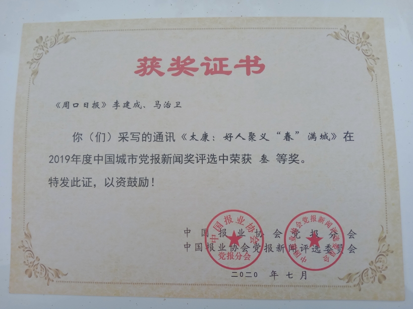 繼太康“五養(yǎng)模式”榮獲3項(xiàng)省級(jí)以上新聞大獎(jiǎng)之后,日前從周口報(bào)業(yè)集團(tuán)新聞研究室再次傳來(lái)好消息,《周口日?qǐng)?bào)》頭版刊發(fā)的太康“好人之城”通訊《太康:好人聚義“春”滿(mǎn)城》(作者:李建成 馬治衛(wèi))一文,榮獲中國(guó)城市黨報(bào)新聞獎(jiǎng)三等獎(jiǎng)。