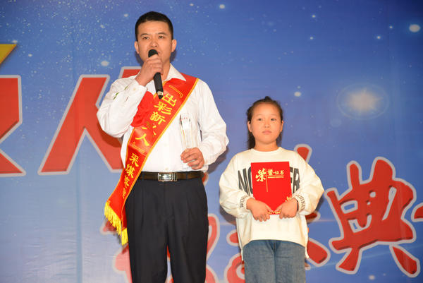 “節(jié)約能手”掘進(jìn)一隊職工師振東在頒獎臺上接過12歲女兒頒發(fā)的獎杯后,還得到了“小棉襖”的熱情擁抱。