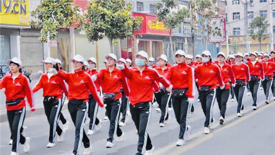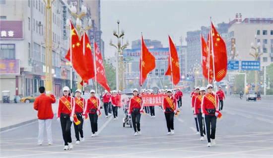10月11日早晨,鄲城大街上迎來了一道靚麗的風(fēng)景線——他們身著鮮艷的紅色運動服,肩扛五星紅旗,手扯橫幅,隨著動感十足的音樂,昂首闊步徜徉在金色的秋天里……