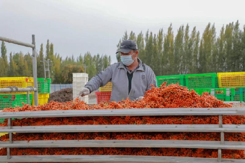 10月12日,記者在托里鎮(zhèn)永集湖村的烘干廠房看到,工人們正忙著處理收購來的沙棘,并推入烘干箱進(jìn)行烘干作業(yè)。