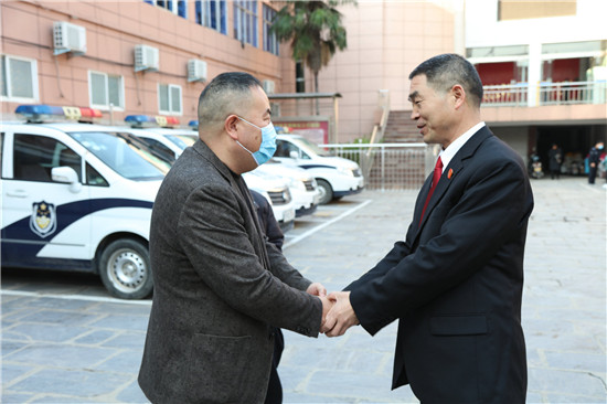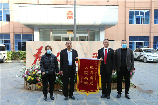 11月19日,侯某某夫婦將一面寫有“見義勇為 人民英雄”的錦旗送到太康縣人民法院法官楊鵬飛手中,表達(dá)一家人對楊鵬飛救助落水女兒的感激之情。