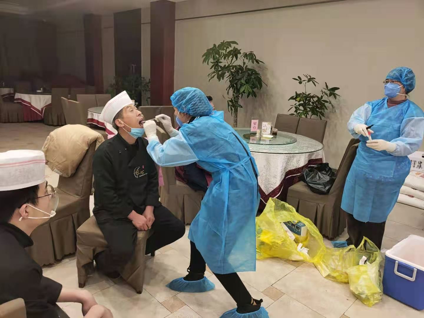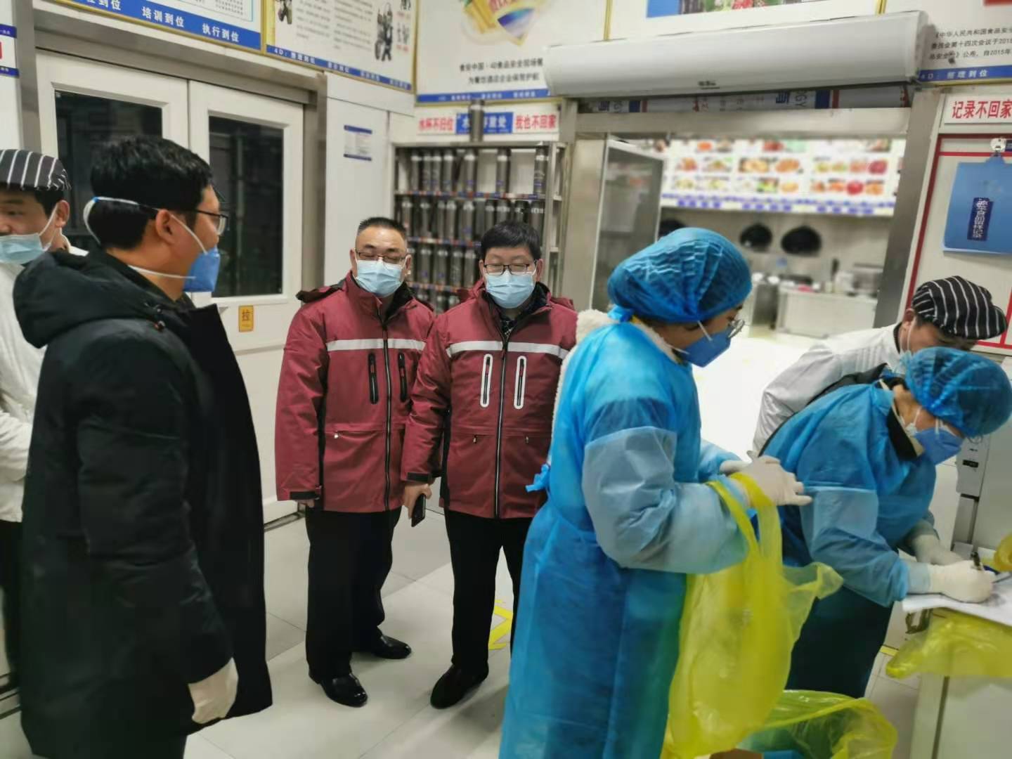 為助力第一屆周商大會圓滿成功,市衛(wèi)生健康委抽調(diào)近百名調(diào)精兵強(qiáng)將組成衛(wèi)生保障專班開展衛(wèi)勤保障工作。圖為工作人員在市委黨校迎賓館和體育賓館餐廳對后廚人員做核酸檢測及開展冷鏈?zhǔn)称废尽?/p>