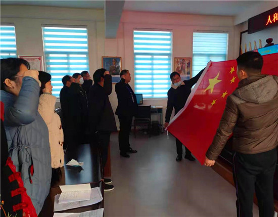 人和街道辦事處人大工委主任韓鈞右手舉拳,領(lǐng)誦誓詞,全體宣誓人肅立,面向國(guó)旗莊嚴(yán)宣誓。