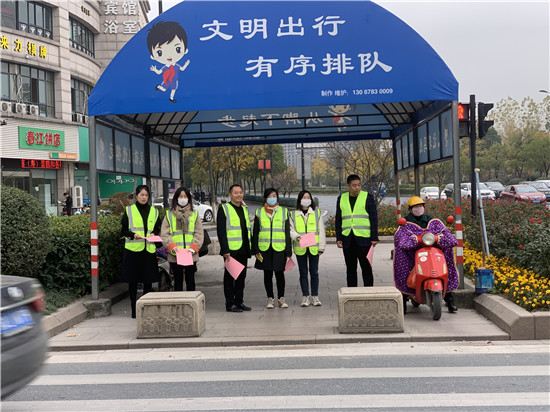 “您好,現(xiàn)在是紅燈,為了安全請(qǐng)等綠燈后再走?!薄罢?qǐng)?jiān)偻笸艘稽c(diǎn),不要擋住汽車(chē)通道……”12月5日是第35個(gè)國(guó)際志愿者日,當(dāng)日上午8時(shí),正值人流高峰期,在浙江省杭州市富陽(yáng)區(qū)春江街道大橋路和春南路交叉口,志愿者崔守領(lǐng)一行人身著反光背心在該路口緊張忙碌著,勸導(dǎo)行人文明出行、安全出行,為冬日的杭州增添了一股股暖意。
