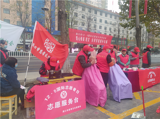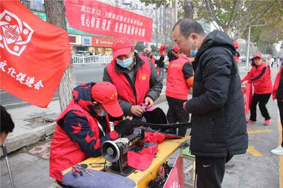 12月6日下午,周口市慈孝文化促進會、周口環(huán)境保護協(xié)會的志愿者來到周口中心城區(qū)五一文化廣場開展以愛心剪發(fā)、免費剪裁、修補衣褲為主要內(nèi)容的便民志愿服務活動。
