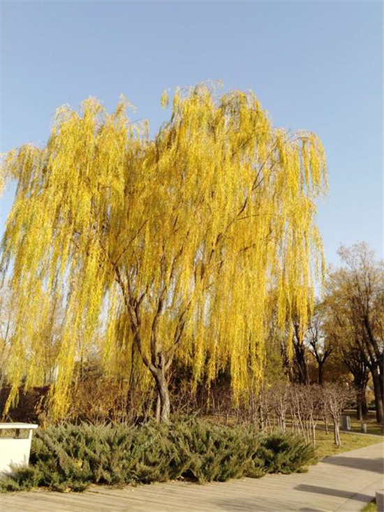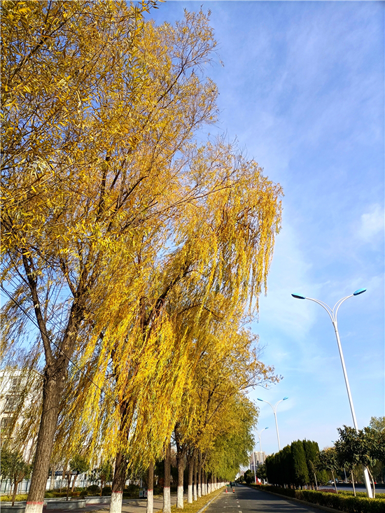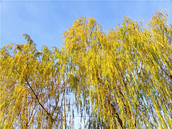 冬日暖陽照三川,垂柳更換鵝黃衫。無盡情思春可寄,千條萬條隨風(fēng)翩。12月15日,我市天氣晴朗,路旁一排排垂柳隨風(fēng)搖曳,像一個(gè)個(gè)舞動(dòng)的小精靈,又像一團(tuán)團(tuán)鵝黃色的薄霧,如此美不勝收的風(fēng)景就像一幅畫,令人忍不住駐足欣賞。