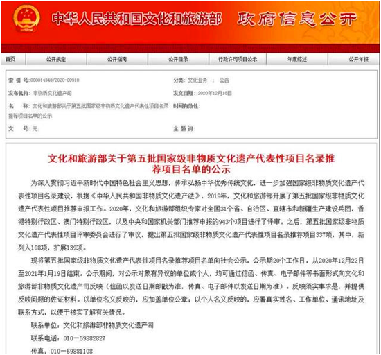 據(jù)了解,2019年,文化和旅游部開展了第五批國家級非物質(zhì)文化遺產(chǎn)代表性項(xiàng)目推薦申報(bào)工作。2020年,文化和旅游部組織專家對全國31個省、自治區(qū)、直轄市和新疆生產(chǎn)建設(shè)兵團(tuán),香港特別行政區(qū)、澳門特別行政區(qū),以及中央和國家機(jī)關(guān)部門推薦申報(bào)的943個項(xiàng)目進(jìn)行了評審。之后,第五批國家級非物質(zhì)文化遺產(chǎn)代表性項(xiàng)目評審委員會進(jìn)行了審議,提出第五批國家級非物質(zhì)文化遺產(chǎn)代表性項(xiàng)目名錄推薦項(xiàng)目337項(xiàng),其中,新列入198項(xiàng),擴(kuò)展139項(xiàng)。