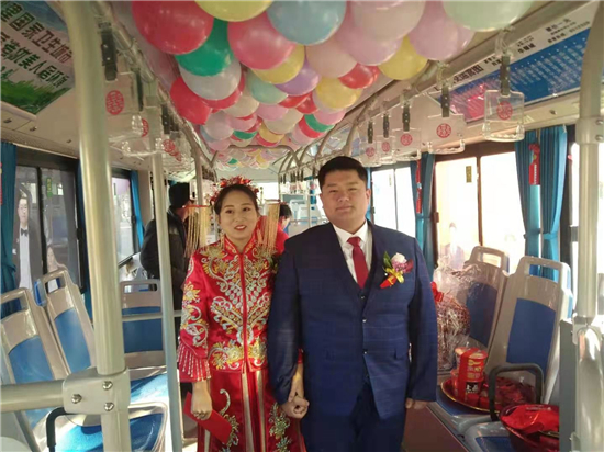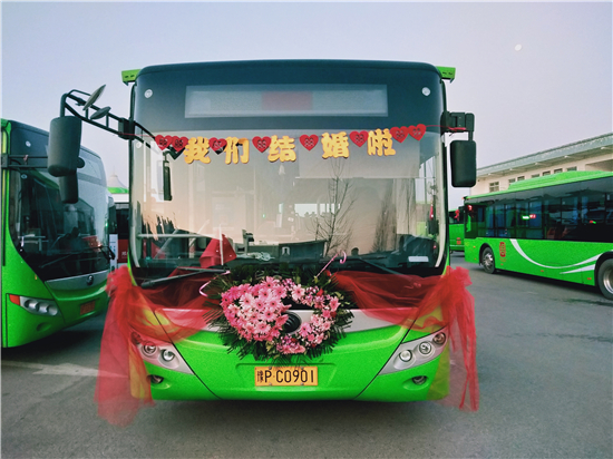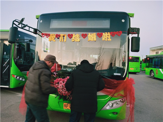 “這個想法是我和我媳婦一起商量出來的。我們覺得別人結(jié)婚都是用婚車,有點千篇一律。我們作為公交人就想另辟蹊徑,用我們公司的公交車當(dāng)婚車,同時也倡導(dǎo)綠色出行,還很有紀(jì)念意義。” 新郎買亞飛告訴記者。