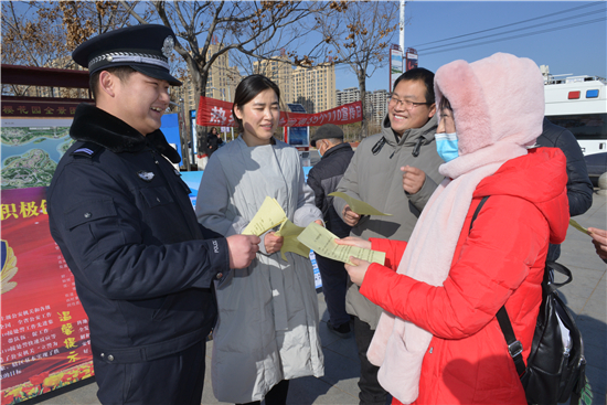 為迎接第35個“110宣傳日”的到來,1月9日,扶溝縣公安局組織民警在人民公園廣場開展“一心為民110,砥礪奮進新征程”為主題宣傳活動。民警通過現(xiàn)場發(fā)放宣傳資料、法律宣傳、警民互動等方式介紹110社會聯(lián)動常識,教群眾如何提升冬季安全防范知識,進一步密切警民關(guān)系。圖為民警向過往群眾發(fā)放宣傳資料。