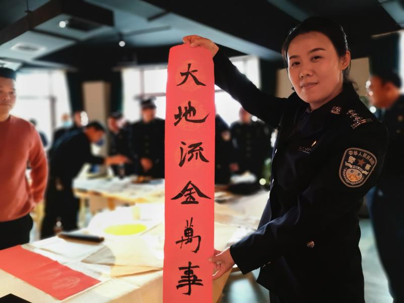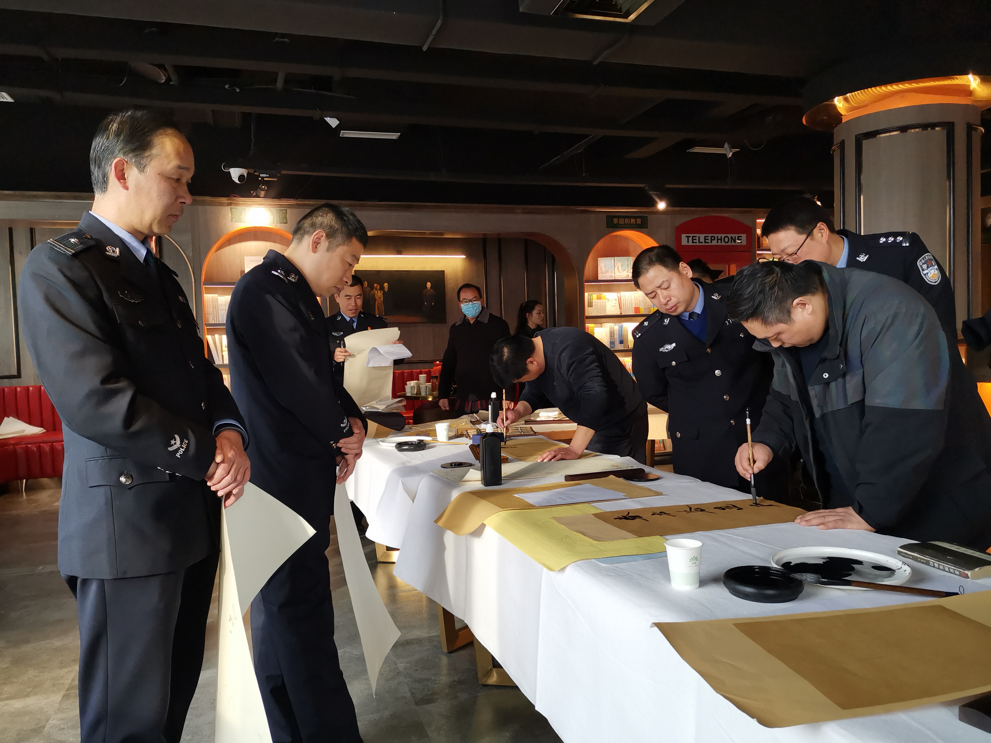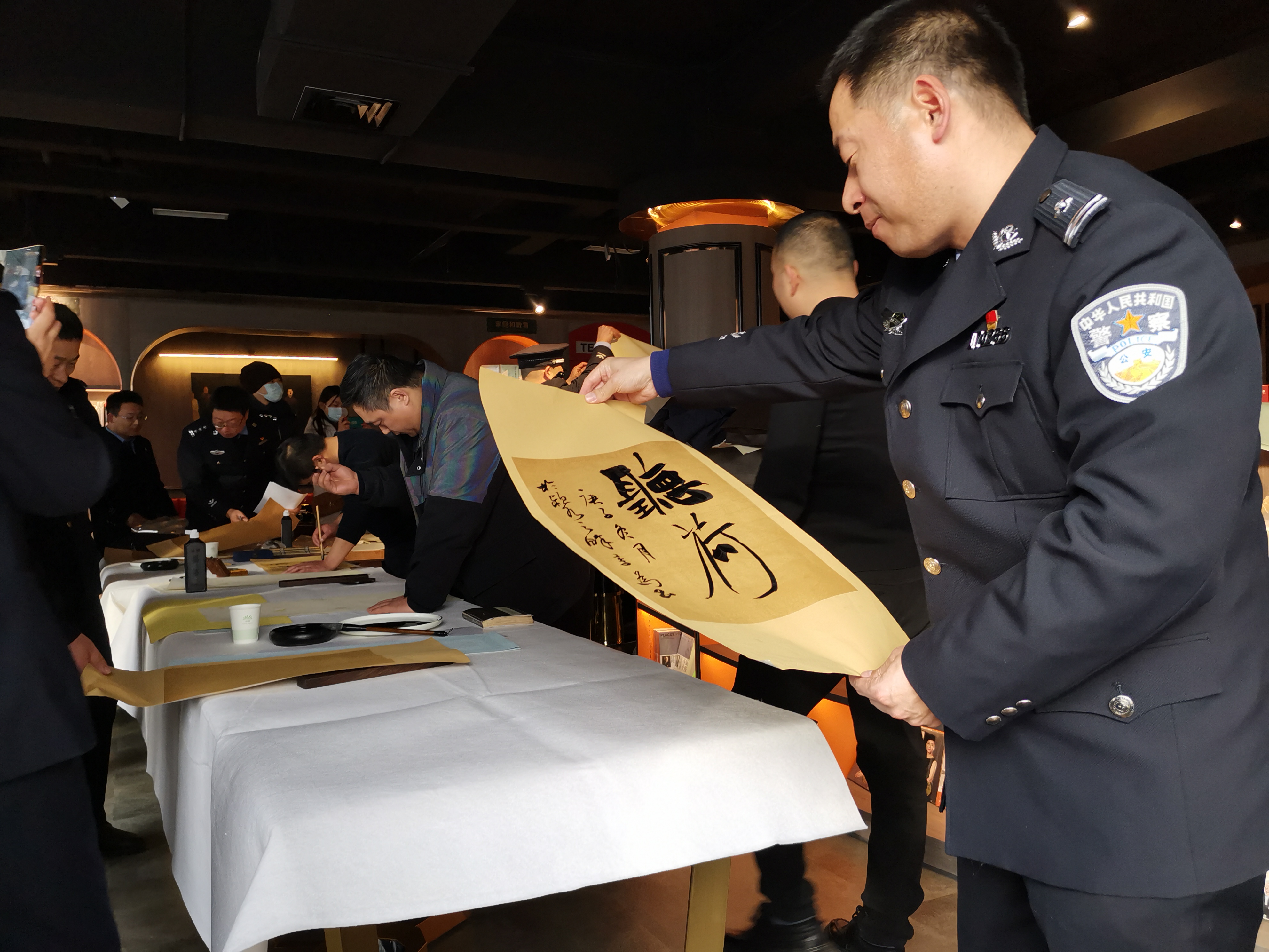 活動(dòng)現(xiàn)場,氣氛熱烈,書法家們現(xiàn)場揮毫潑墨、筆走龍蛇,帶著喜迎牛年的美好祝愿。民警、輔警爭相圍觀,觀看、揣摩書法家們蒼勁有力的書法作品,房間內(nèi)洋溢著濃郁的節(jié)日氣息。