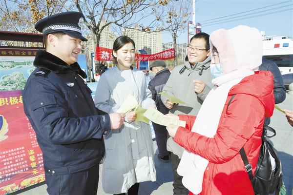 今年1月10日是第35個(gè)“110宣傳日”,也是首個(gè)“中國人民警察節(jié)”。我市公安系統(tǒng)圍繞“一心為民110,砥礪奮進(jìn)新征程”這一主題,開展了大型宣傳活動(dòng)。圖為扶溝公安民警向群眾發(fā)放宣傳資料。