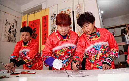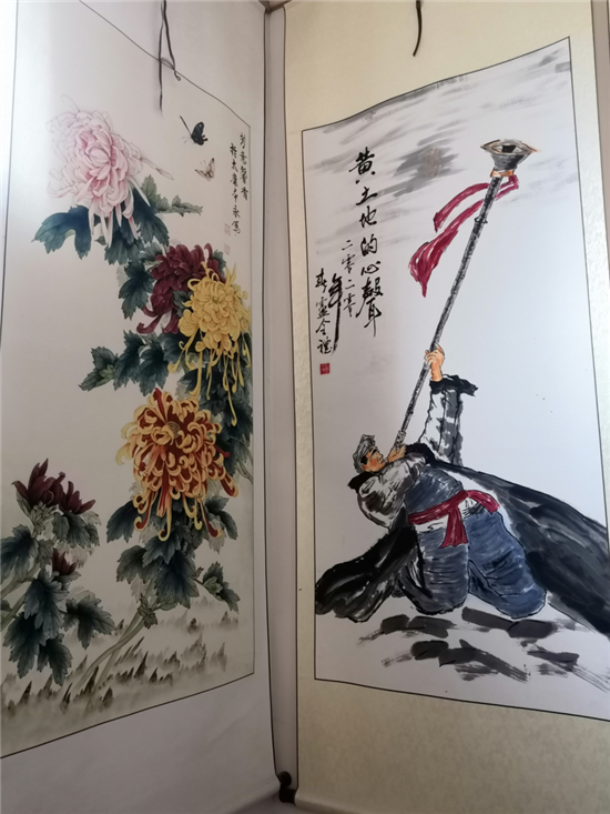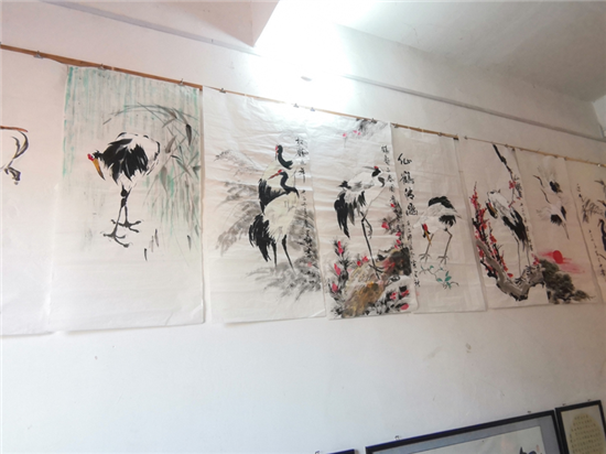 在建豪工作室的斜對面,是50歲村黨支部書記、村文聯(lián)主席盧全禮的書畫工作室。盧全禮書畫兼擅,還會武術(shù)、木刻、舞獅子,是附近有名的才子。記者看到,他為太康縣第二屆農(nóng)民豐收節(jié)創(chuàng)作的中國畫《黃土地的心聲》,以該村嗩吶吹奏藝人幸福而夸張的演出情景,歌頌農(nóng)村脫貧攻堅(jiān)取得的巨大成果,極具鄉(xiāng)土氣息。在他的畫室,滿身文藝范兒的五西村民,正以新時代松鶴延年吉祥農(nóng)民畫,齊心打造中原畫鶴第一村。經(jīng)過培訓(xùn)的農(nóng)村大嫂大媽執(zhí)筆齊描畫,一時鶴鳴九皋,翩翩欲飛。
