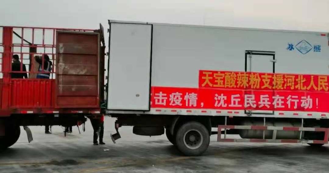于是,他當(dāng)即與河北省南宮市相關(guān)防疫部門取得聯(lián)系,天宮那邊欣然接受,并表示感謝。1月20日當(dāng)夜,便組織召集村上的“鐵桿工人”連夜加班加點生產(chǎn)了價值5萬元共計1萬盒“天寶酸辣粉”,無償捐贈給河北天宮市,送去來自沈丘縣中豫天寶食品有限公司的一片愛心。