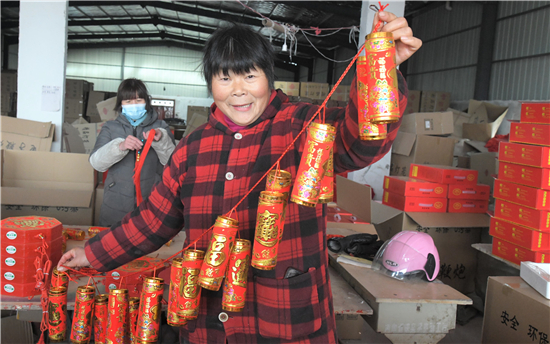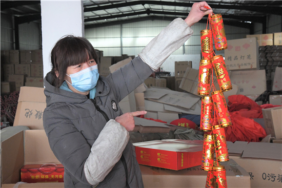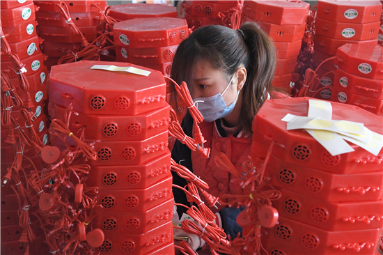 2月2日,在商水縣魏集鎮(zhèn)產(chǎn)業(yè)扶貧基地一帆工藝制作工廠,村民正在生產(chǎn)安全、環(huán)保、無污染的電子鞭炮。春節(jié)臨近,不能燃放傳統(tǒng)鞭炮的市民非常喜歡這種高科技替代產(chǎn)品,產(chǎn)品供不應求。③2