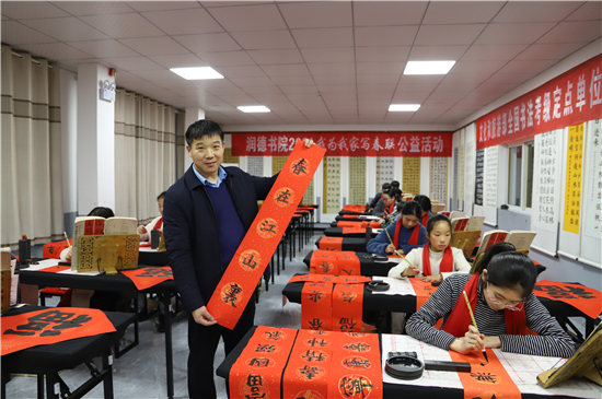 “春聯(lián)是我們中華民族獨(dú)有的文化符號(hào),象征著喜慶,蘊(yùn)含著吉祥。我為我家寫春聯(lián)公益活動(dòng)具有很強(qiáng)的廣泛性、群眾性、公益性,送祝福、亮成績(jī)與弘揚(yáng)傳承中華優(yōu)秀傳統(tǒng)文化相結(jié)合,在學(xué)生心中樹立了文化自信?!标悈顷懶牢康卣f。