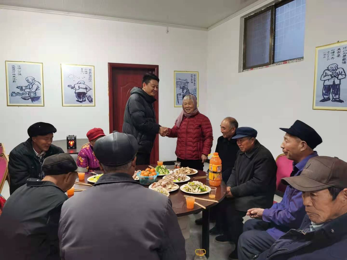 2月11日,除夕夜,《沒(méi)有共產(chǎn)黨就沒(méi)有新中國(guó)》的歌聲回蕩在太康縣毛莊鎮(zhèn)王隆集居村聯(lián)養(yǎng)點(diǎn)的上空。餐廳內(nèi)水果、飲料、白酒、四葷、四素八個(gè)涼菜和雞塊、丸子八個(gè)熱菜整齊地?cái)[放在桌子上。