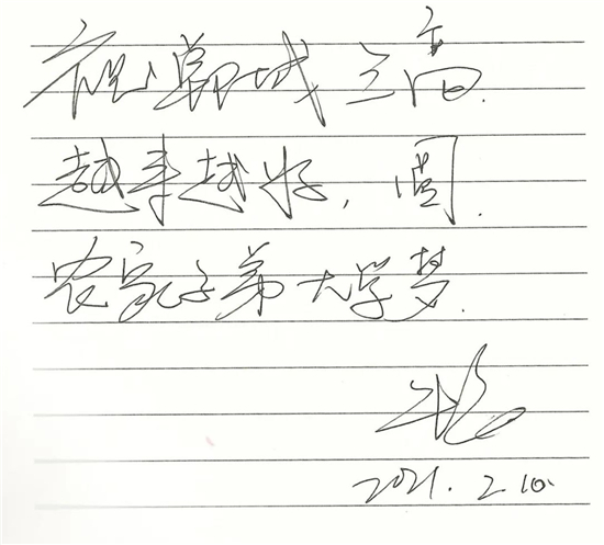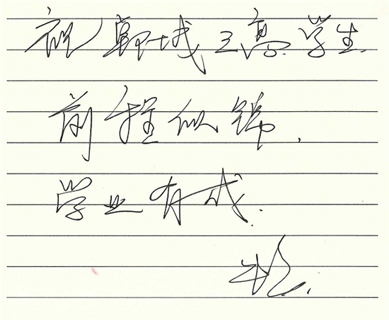 朱婷雖然很少回家,但是一直關(guān)注老家鄲城的發(fā)展變化,特別關(guān)注鄲城的教育發(fā)展,當(dāng)她得知鄲城三高率先提煉出“孝、勤、韌、忠、濟(jì)”為核心的朱婷精神,并把這種精神作為鄲城三高學(xué)子的精神引領(lǐng)時非常感動,為鄲城三高始終堅持立德樹人的教育理念而高興,為鄲城三高學(xué)子的拼搏進(jìn)取精神而欣慰,為鄲城三高辦學(xué)成果而點贊,并欣然寫下:“ 祝鄲城三高越來越好,圓農(nóng)家子弟大學(xué)夢;祝鄲城三高學(xué)生前程似錦,學(xué)業(yè)有成?!?/p>
