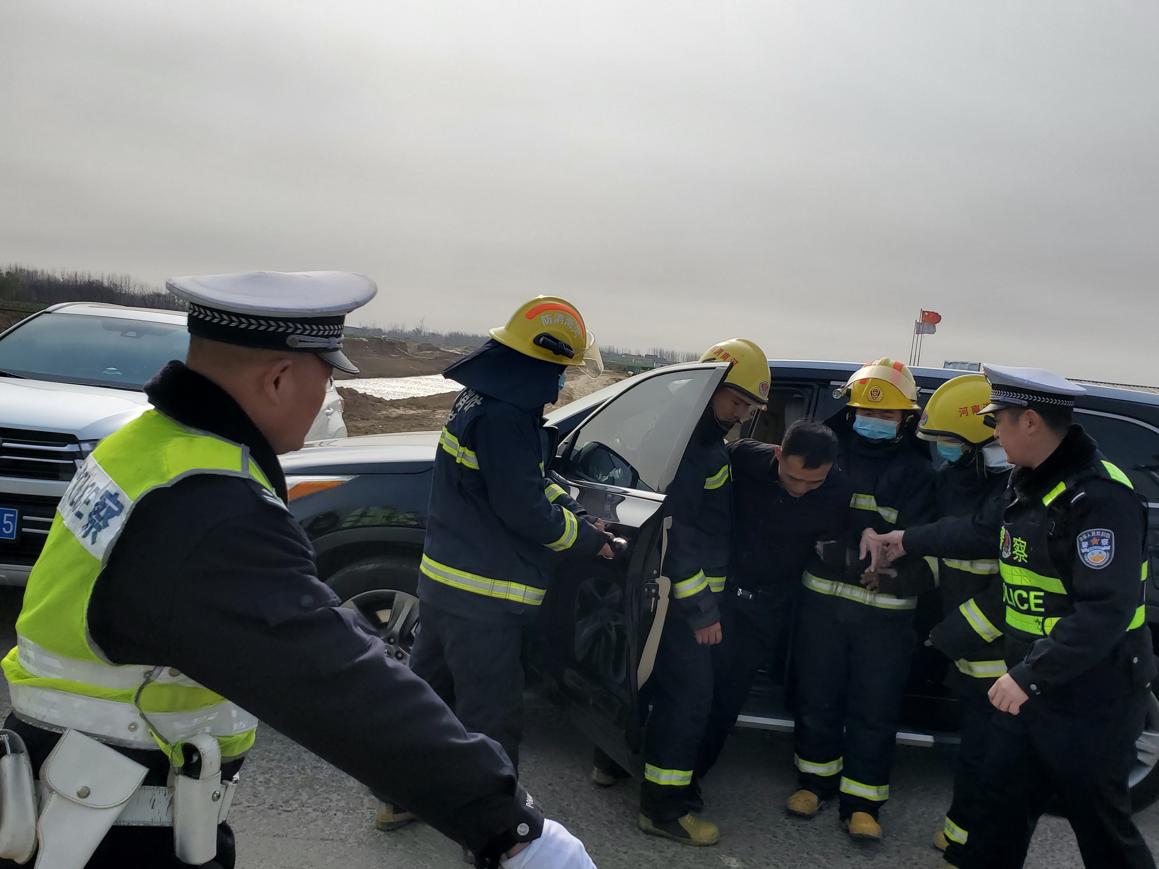 演練模擬2月23日10許,在G220國道河南安徽二省交界友誼橋處,二輛越野車在道路中心線處相撞,二輛車駕駛?cè)祟^部受傷流血,車門被卡,車輛起火冒煙道路嚴重擁堵、情況危急。接到報警后,交警部門立即向上級進行匯報,“四位一體”聯(lián)動工作機制隨即啟動,相關(guān)部門迅速趕往現(xiàn)場開展事故處置和救援工作。同時會同交警、屬地派出所,消防救援、醫(yī)療救護部門一起協(xié)助開展相關(guān)工作。隨后事故民警按照現(xiàn)場勘查要求,迅速對現(xiàn)場進行勘查、拍照,提取相關(guān)證據(jù),配合搶險、醫(yī)療施救各部門,并對現(xiàn)場遺留物品進行清理、登記并妥善保管??辈榻Y(jié)束后交警部門解除警戒區(qū),將車輛疏導、分流完畢后撤離現(xiàn)場。
