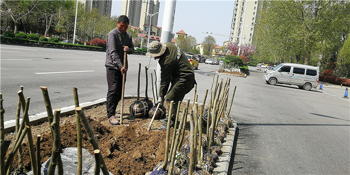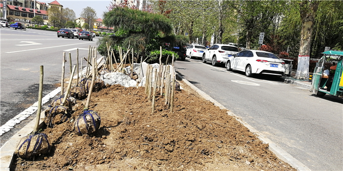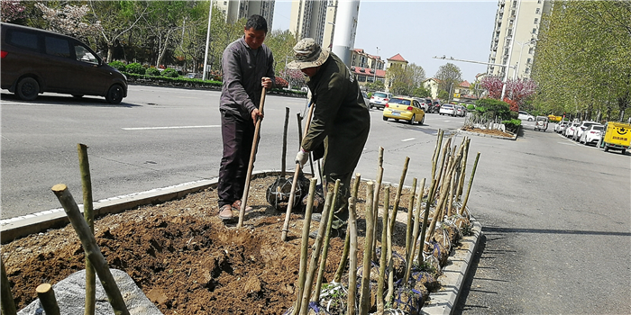 仲春時節(jié),我市積極打造街頭游園、口袋公園,增加市民休閑游樂場所。圖為園林工人正在施工。②7
