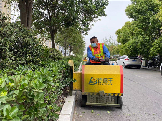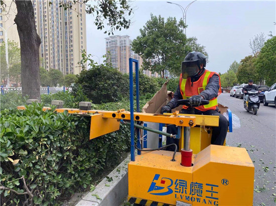 4月13日,周口大道上園林工人操作著特殊的園林作業(yè)車,修剪路邊的綠化樹(shù),使用“電推子”,不僅提高了效率、節(jié)省了人力,就連“剃”出來(lái)的“平頭”也更平了?!半娡谱印彼街帲G化樹(shù)被修剪得很齊整。②9
