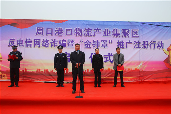 為打擊治理電信網(wǎng)絡詐騙犯罪,降低詐騙案件發(fā)生率,4月13日,周口港區(qū)舉辦反電信網(wǎng)絡詐騙宣傳暨“金鐘罩”推廣注冊行動啟動儀式,宣傳反電詐知識,推廣公安部門推出的反詐騙系統(tǒng)平臺“金鐘罩”。港區(qū)黨委書記孫鵬到場宣布行動正式啟動,港區(qū)黨委委員、紀委書記李素芹,公安分局局長康群泉在儀式上講話。