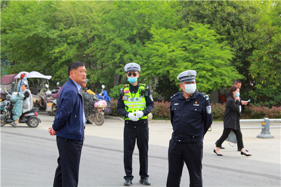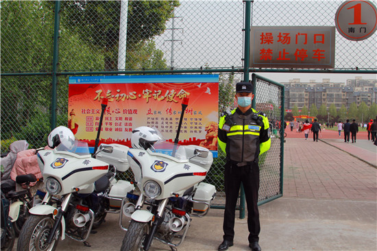 活動計劃是上午9時開始,朱衛(wèi)兵帶領鐵騎隊從早上7點就來到校園周邊布置崗哨,對鄲城一高周邊的校園路、公園東路、一高北路、一高東路、公園北路進行車輛引導,共出動警力46人,警車一部,警用摩托車21輛,形成了各路口有崗、50米一哨。一方面確保車輛有序停放,另一方面守護師生和家長安全。