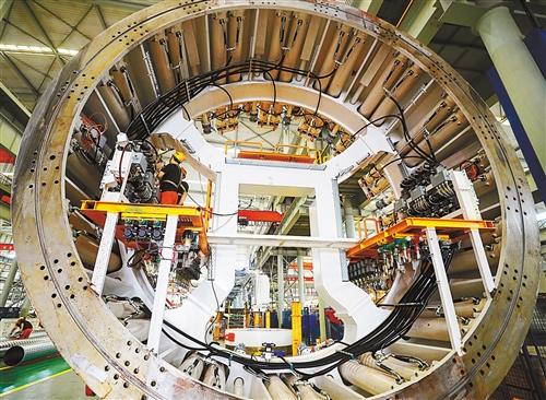 鄭州市經(jīng)開區(qū)中鐵工程裝備集團(tuán)有限公司生產(chǎn)車間,工人在加緊生產(chǎn)。2009年在鄭州成立的中鐵裝備,目前已是中國最大的隧道掘進(jìn)機(jī)制造服務(wù)商。 聶冬晗攝(中經(jīng)視覺)