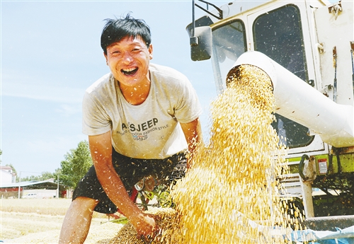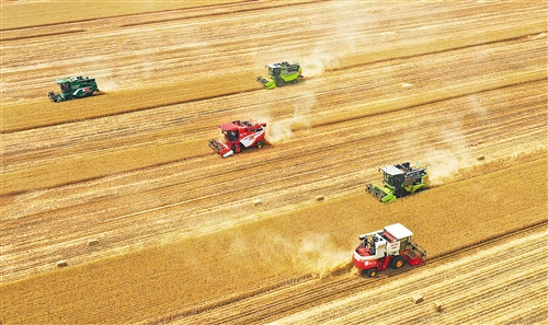 開封市尉氏縣邢莊鄉(xiāng)府李莊村,農(nóng)機(jī)服務(wù)隊幫助村民收獲小麥。    李新義攝(中經(jīng)視覺)