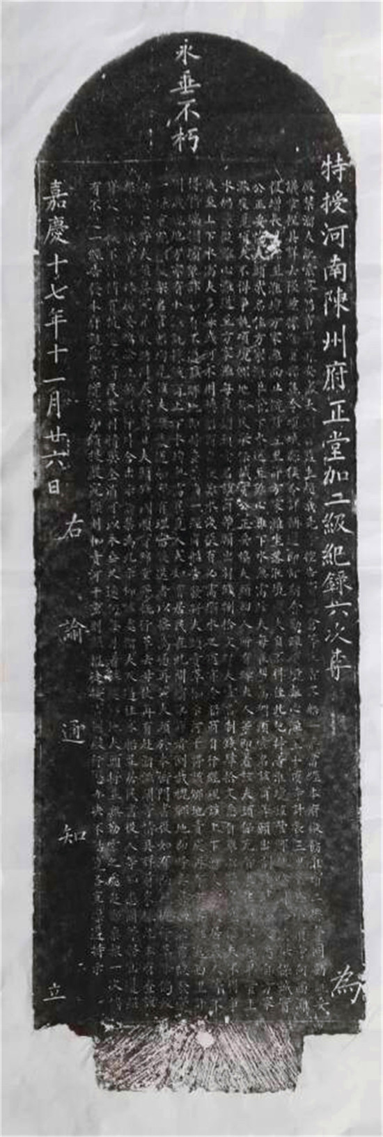 說它“緘默不語”,其實(shí)并不準(zhǔn)確。這通石碑通體有字,碑的陽面為清同治八年四月十六日淮沈項(xiàng)分縣縣丞孫茂悟所刊刻的嚴(yán)禁溜夫訛索客船事告示,碑的陰面為附文,內(nèi)容為重刊的清嘉慶十七年十一月二十六日陳州知府李振翥制定的嚴(yán)禁溜夫訛索客船事章程,是對公告內(nèi)容的重申,兩面碑文內(nèi)容大致相同,加起來共有1100余字,均為約束溜夫行為的公告或章程。碑首追刻的有四個大字:永垂不朽。
