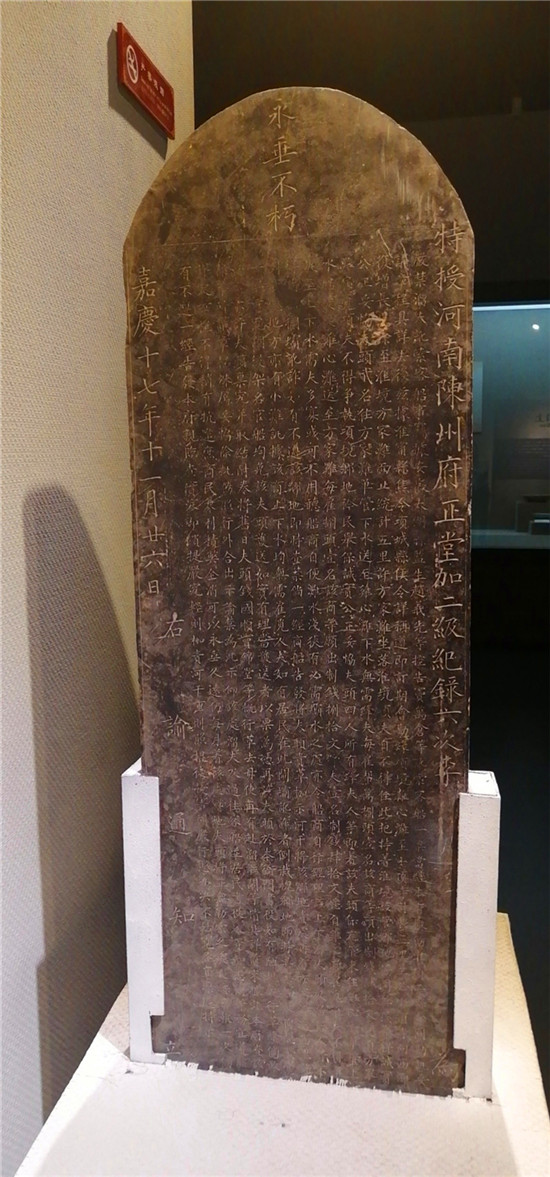 這家店的主人叫段清海,他從事刻碑行業(yè)多年,經(jīng)驗(yàn)頗豐,從第一眼看到這通石碑,憑直覺就感覺它來歷不凡?!爱?dāng)時那個人把這通碑送到店里,要求把上面的字磨掉,重新刻成一塊墓碑。我仔細(xì)一看,這通碑的表面雖然有些微磨損,字跡稍顯模糊,但細(xì)致觀察,能發(fā)現(xiàn)碑文的落款為清嘉慶十七年(1812年)和清同治八年(1869年)。也是不忍心吧,我沒有把它毀掉,而是免費(fèi)為那個人刻了一通新碑,就把這通年代久遠(yuǎn)的舊碑留下來了。”段清?;貞浾f,2012年的時候,他聽說周口市博物館面向全市征集古物,他第一時間把石碑送交到周口市博物館,沒有要一分錢,“它在我的店里放了四年,期間好幾次差點(diǎn)被送貨拉貨的工人損壞,交給博物館總算是給它找了一個‘安穩(wěn)’的家,我的心里也算踏實(shí)了”。