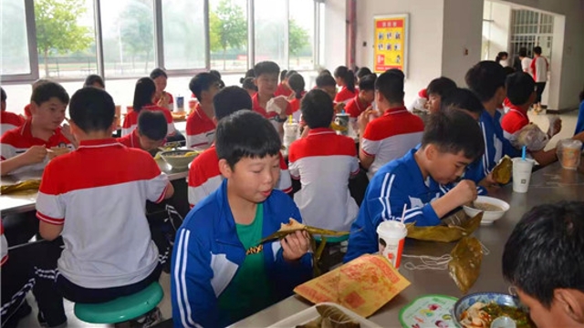 6月14日,端午節(jié),鄲城縣第二實(shí)驗(yàn)中學(xué)朱玉良、李繼元等校領(lǐng)導(dǎo)在餐廳和學(xué)生一起集體過端午。