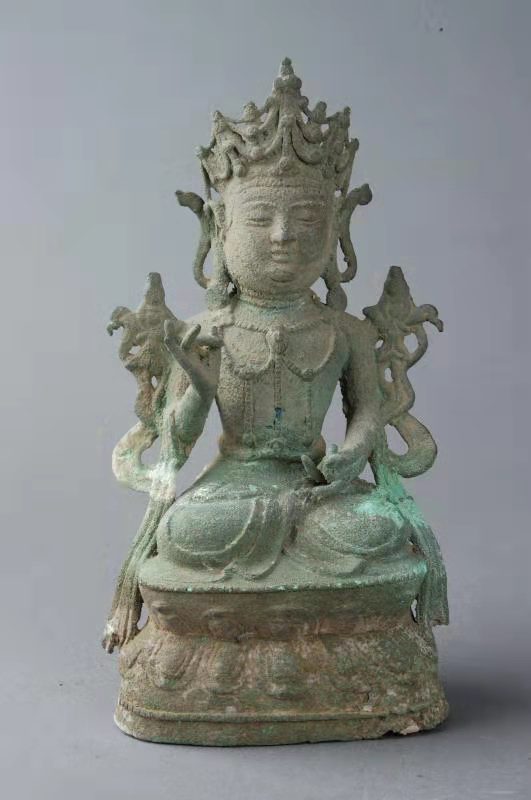 商水壽圣寺塔,高41.5米,為九級樓閣式磚塔。塔體從底至頂漸收勻稱,平面呈正六邊形。塔頂用鑄鐵鑄成葫蘆形寶頂,給人以挺拔雋秀之感。塔的層檐收放尺寸設計精妙,既保護了塔墻免遭雨雪侵蝕,又使塔體顯得莊重肅穆。塔身諸層外壁皆辟有圓券門、破子欞假窗,塔身各角砌出倚柱,檐下密布磚雕斗拱。塔內砌出塔心室和盤旋梯道,可逐層登高至塔頂。塔第一層,南面辟門,門楣上刻“明道二年癸酉歲三月一日丙寅時戊寅日,葬舍利院主。僧□□建□□功德塔”。說明建塔的年代是北宋。塔室為穹窿頂。東南、西南兩壁有破子欞盲窗各1個,西壁另辟一拱券門,有踏道可登至第二層塔心室。第二層,南面辟門,東南、西南兩壁各砌一盲窗,東壁另辟一門可沿踏道進入第三層。以上諸層大同小異。第四層,塔心室內北墻嵌石雕佛像3尊,兩尊盤膝正面像,一尊盤膝背面像。剎柱下端插入塔心室,上端置鐵質寶瓶,在不同部位還發(fā)現(xiàn)“風調雨順”“國泰民安”“周王千歲千千歲”“大明嘉靖二十八年九月吉日”“河南周府施舍西華小瑤集壽圣寺塔一座”等字樣,這些都說明了明代嘉靖年間,又重修了塔身。1998年9月,在維修該塔時,在天宮清理出明代銅佛像3尊,白釉瓷盤1只,白釉黑花瓷碗、白釉褐花瓷碗各1個,刻印大彌陀經(jīng)1卷。銅佛像高約20厘米,其中一尊有“嘉靖三十一年”字樣,這一時期的周王為周敬王朱在鋌,這說明嘉靖三十一年周敬王朱在鋌為祈福曾將這批器物和經(jīng)卷,置入了塔頂?shù)蔫F質寶瓶中。