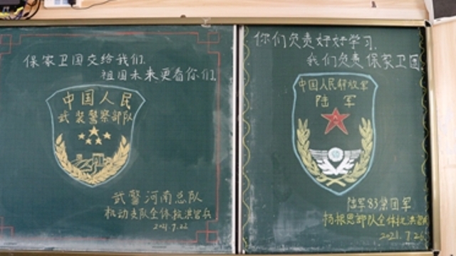 • ??“保家衛(wèi)國交給我們,祖國未來更看你們!”“你們負責好好學習,我們負責保家衛(wèi)國!”在鄭州市第七十三中學的一間教室里,參與救災援助的抗洪官兵們給同學們留下了兩幅黑板報。在師生們眼里,這就是名副其實的“最美黑板報”。