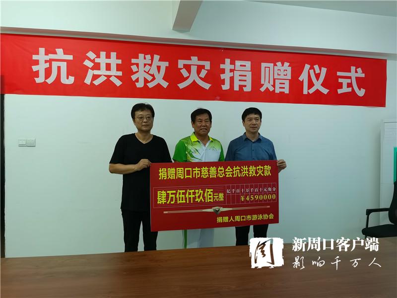 7月31日上午,市游泳協(xié)會(huì)通過(guò)市慈善總會(huì)定向捐贈(zèng)川匯區(qū)防汛搶險(xiǎn)款4.59萬(wàn)元。