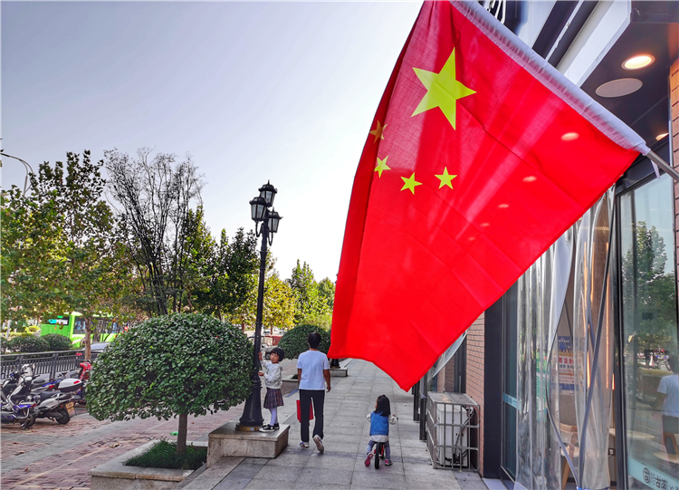 9月30日,市區(qū)臨街商鋪門前五星紅旗隨處可見,紅旗隨風(fēng)飄揚,將街道裝扮一新,喜迎國慶節(jié)的到來