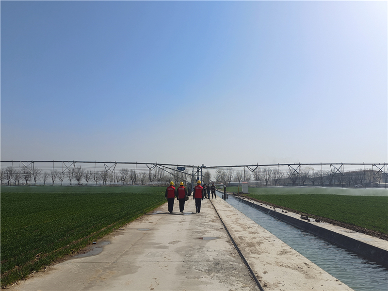 放眼望去,一座座白色的標(biāo)準(zhǔn)化通電機(jī)井房坐落在麥田地頭,源源不斷的井水流進(jìn)蓄水池里,不斷冒出歡快的水花。一旁的大型電動(dòng)平移式噴灌機(jī)把井水過(guò)濾后,澆灌出一片片盎然綠意。遠(yuǎn)處身穿紅馬甲、頭戴安全帽的供電檢修人員正在對(duì)抽水專(zhuān)變進(jìn)行認(rèn)真細(xì)致地檢查。