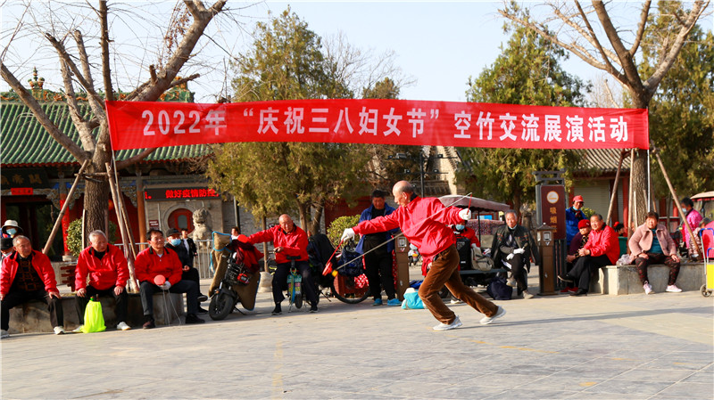 3月8日,周口市空竹運(yùn)動(dòng)協(xié)會(huì)在周口關(guān)帝廟廣場舉行慶?!叭恕眹H婦女節(jié)空竹交流展演活動(dòng),20多名空竹愛好者相繼表演了空竹運(yùn)動(dòng)的各種技法,讓現(xiàn)場群眾大開眼界。