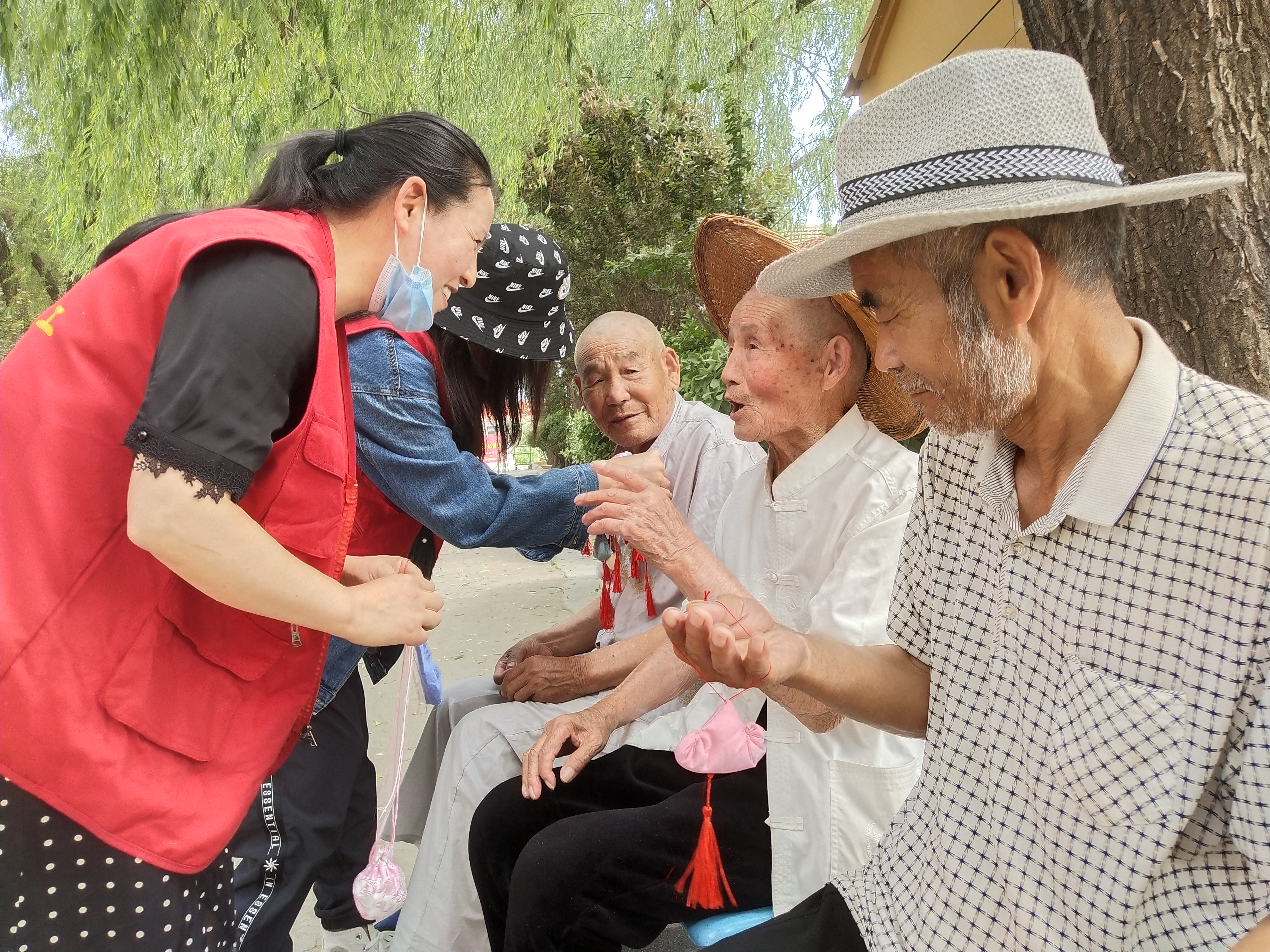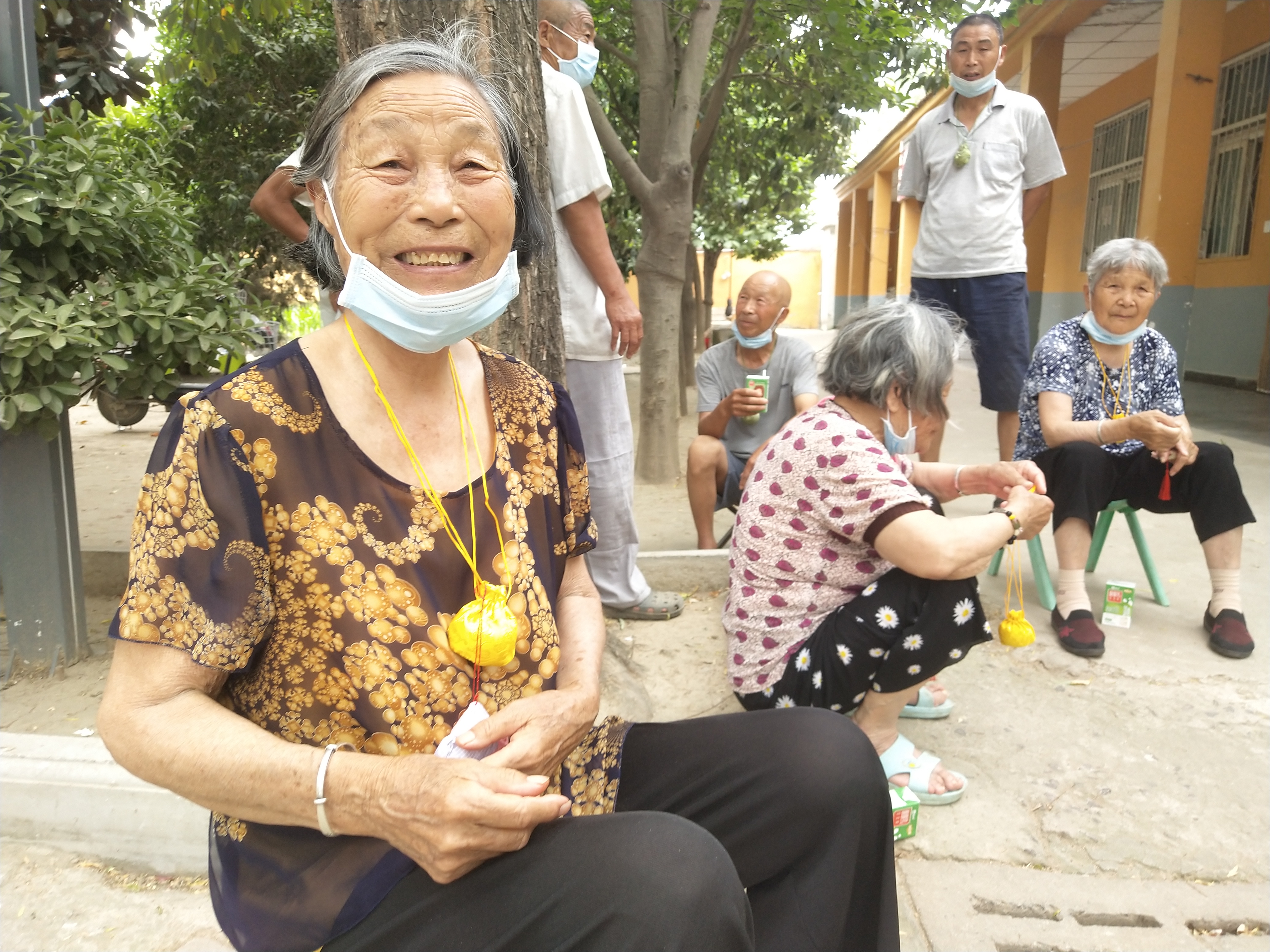 “大爺,大娘,來吃水果,我把香包給您戴上,祝您端午安康,健康長(zhǎng)壽......”劉玉英委托的愛心志愿者戚素華、劉影、袁鳳蓮、李霞、姚君英、李艷紅、王香清等還給敬老院的老人送來了粽子、水果,和老人聊天交談、佩戴香包,老人們臉上綻開了幸福的笑容。