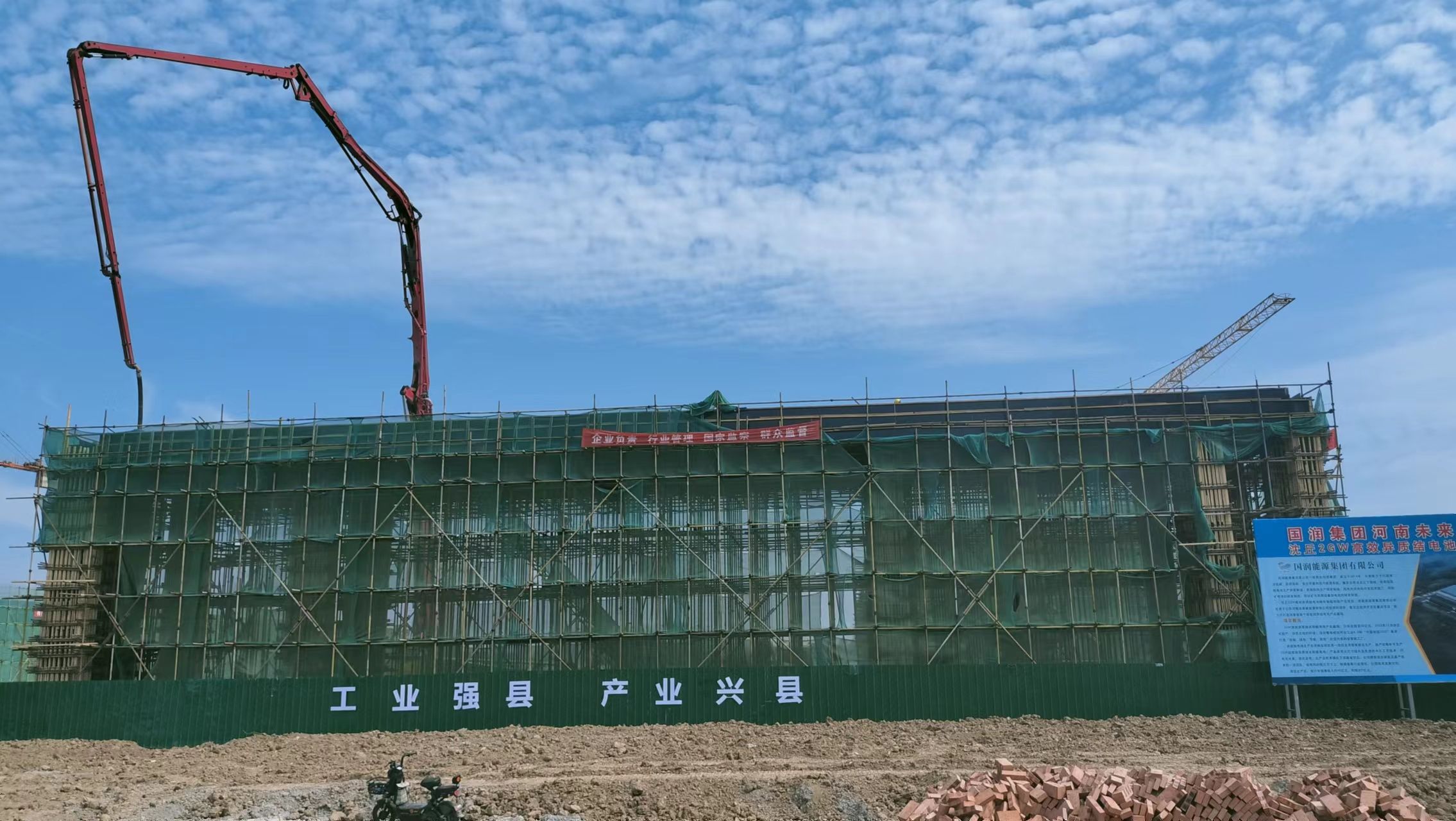 離開(kāi)標(biāo)準(zhǔn)化廠房建設(shè)工地,記者又來(lái)到位于沈丘縣現(xiàn)代科技產(chǎn)業(yè)園內(nèi)的河南未來(lái)新能源沈丘2GW高效異質(zhì)結(jié)(HJT)電池綠色智能制造項(xiàng)目工地,那里也是塔吊林立,一片繁忙景象。高端電池生產(chǎn)車間正在緊張施工中,一臺(tái)灌漿機(jī)正在澆筑房頂。項(xiàng)目部負(fù)責(zé)人張旭輝說(shuō):“正在建設(shè)的是高端太陽(yáng)能芯片生產(chǎn)車間主廠房面積2.41萬(wàn)平方米,鋼架5200平方米,10月底完工,11月份安裝設(shè)備?!?/p>