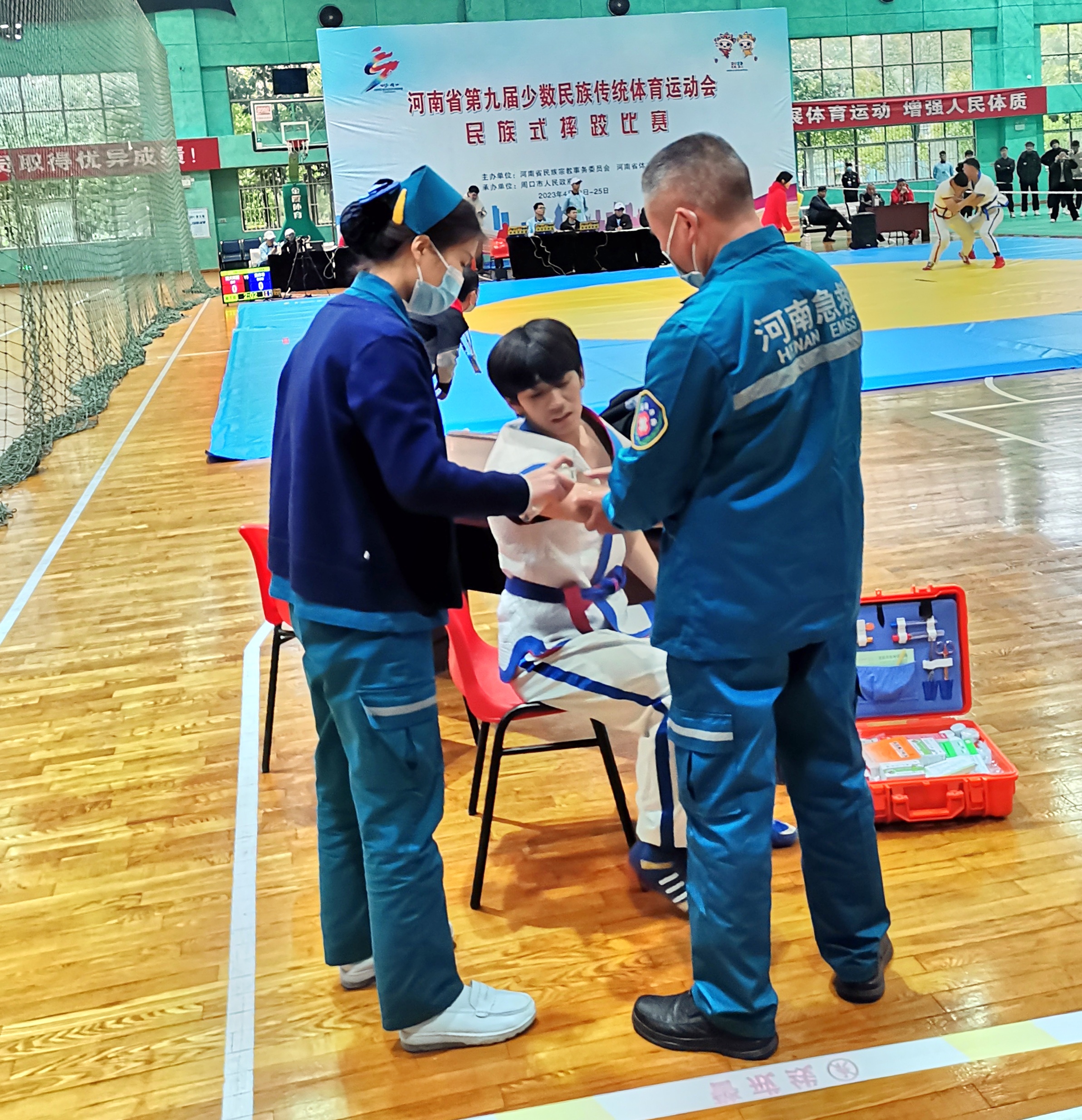 4月22日至26日,河南省第九屆少數民族傳統(tǒng)體育運動會在周口市舉辦。為確保來賓、運動員、教練員、技術官員等參會人員的醫(yī)療衛(wèi)生安全,周口市衛(wèi)生健康部門全面調動全市醫(yī)療資源,建立覆蓋各競賽項目及指定接待賓館的醫(yī)療救治、衛(wèi)生監(jiān)督、防疫消殺等醫(yī)療保健服務體系,認真完善各項工作方案、預案,制定細化工作流程,為省運動會提供及時有效、熱情周到的醫(yī)療衛(wèi)生保障服務。圖為運動員在比賽中受傷,現場保障的醫(yī)護人員迅速處置。