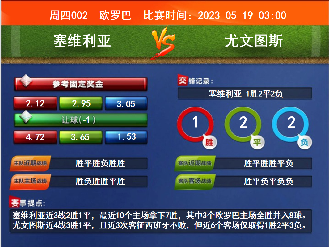 比賽時(shí)間:2023-05-19 03:00賽事提點(diǎn):塞維利亞近3戰(zhàn)2勝1平,最近10個(gè)主場(chǎng)拿下7勝,其中3個(gè)歐羅巴主場(chǎng)全勝并入8球。尤文圖斯近4戰(zhàn)3勝1平,且近3次客征西班牙不敗,但近6個(gè)客場(chǎng)僅取得1勝2平3負(fù)。