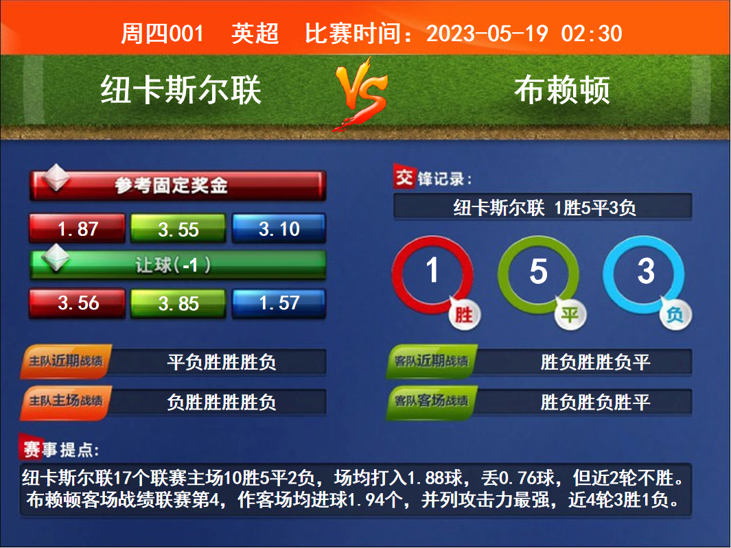 比賽時(shí)間:2023-05-19 02:30賽事提點(diǎn):紐卡斯?fàn)柭?lián)17個(gè)聯(lián)賽主場(chǎng)10勝5平2負(fù),場(chǎng)均打入1.88球,丟0.76球,但近2輪不勝。布賴頓客場(chǎng)戰(zhàn)績(jī)聯(lián)賽第4,作客場(chǎng)均進(jìn)球1.94個(gè),并列攻擊力最強(qiáng),近4輪3勝1負(fù)。