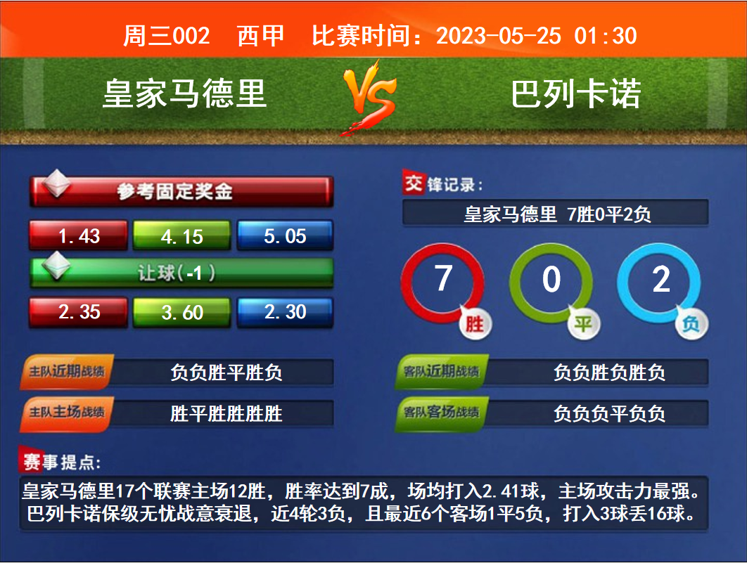 比賽時間:2023-05-25 01:30 賽事提點(diǎn):皇家馬德里17個聯(lián)賽主場12勝,勝率達(dá)到7成,場均打入2.41球,主場攻擊力最強(qiáng)。巴列卡諾保級無憂戰(zhàn)意衰退,近4輪3負(fù),且最近6個客場1平5負(fù),打入3球丟16球。