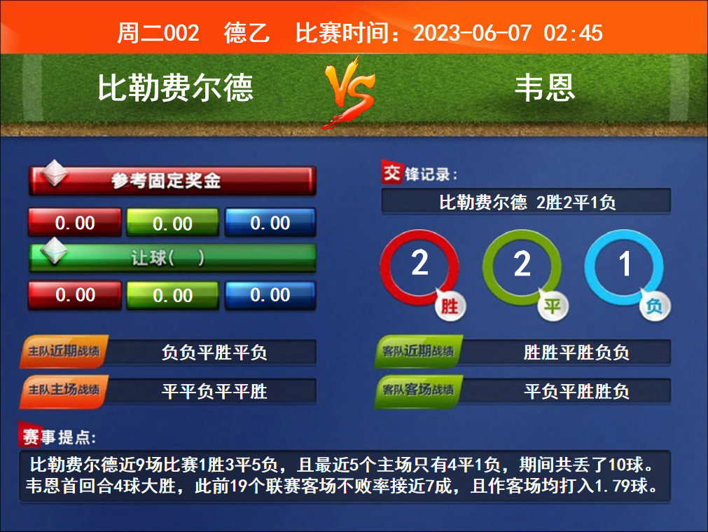 賽事提點(diǎn):比勒費(fèi)爾德近9場比賽1勝3平5負(fù),且最近5個(gè)主場只有4平1負(fù),期間共丟了10球。韋恩首回合4球大勝,此前19個(gè)聯(lián)賽客場不敗率接近7成,且作客場均打入1.79球。