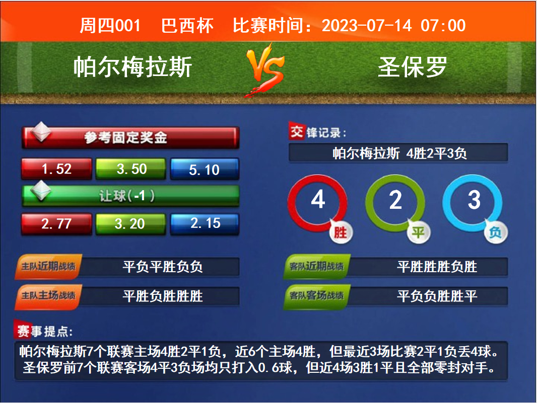 比賽時間:2023-07-14 07:00賽事提點:帕爾梅拉斯7個聯(lián)賽主場4勝2平1負,近6個主場4勝,但最近3場比賽2平1負丟4球。圣保羅前7個聯(lián)賽客場4平3負場均只打入0.6球,但近4場3勝1平且全部零封對手。