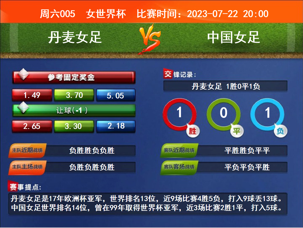 比賽時間:2023-07-22 20:00賽事提點:丹麥女足是17年歐洲杯亞軍,世界排名13位,近9場比賽4勝5負,打入9球丟13球。中國女足世界排名14位,曾在99年取得世界杯亞軍,近3場比賽2勝1平,打入5球。