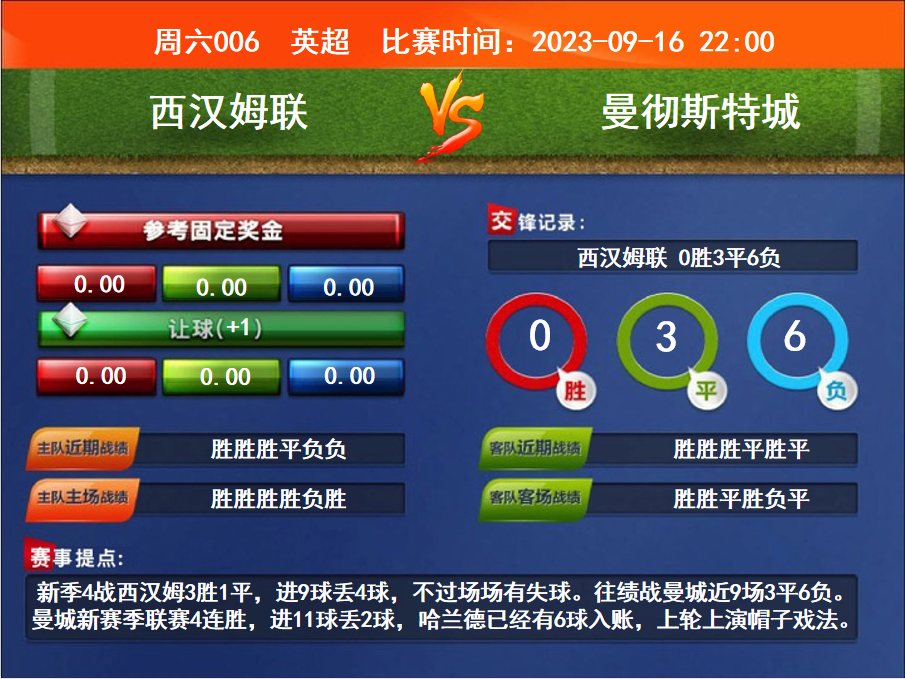 比賽時間:2023-09-16 22:00賽事提點:新季4戰(zhàn)西漢姆3勝1平,進9球丟4球,不過場場有失球。往績戰(zhàn)曼城近9場3平6負。曼城新賽季聯(lián)賽4連勝,進11球丟2球,哈蘭德已經(jīng)有6球入賬,上輪上演帽子戲法。